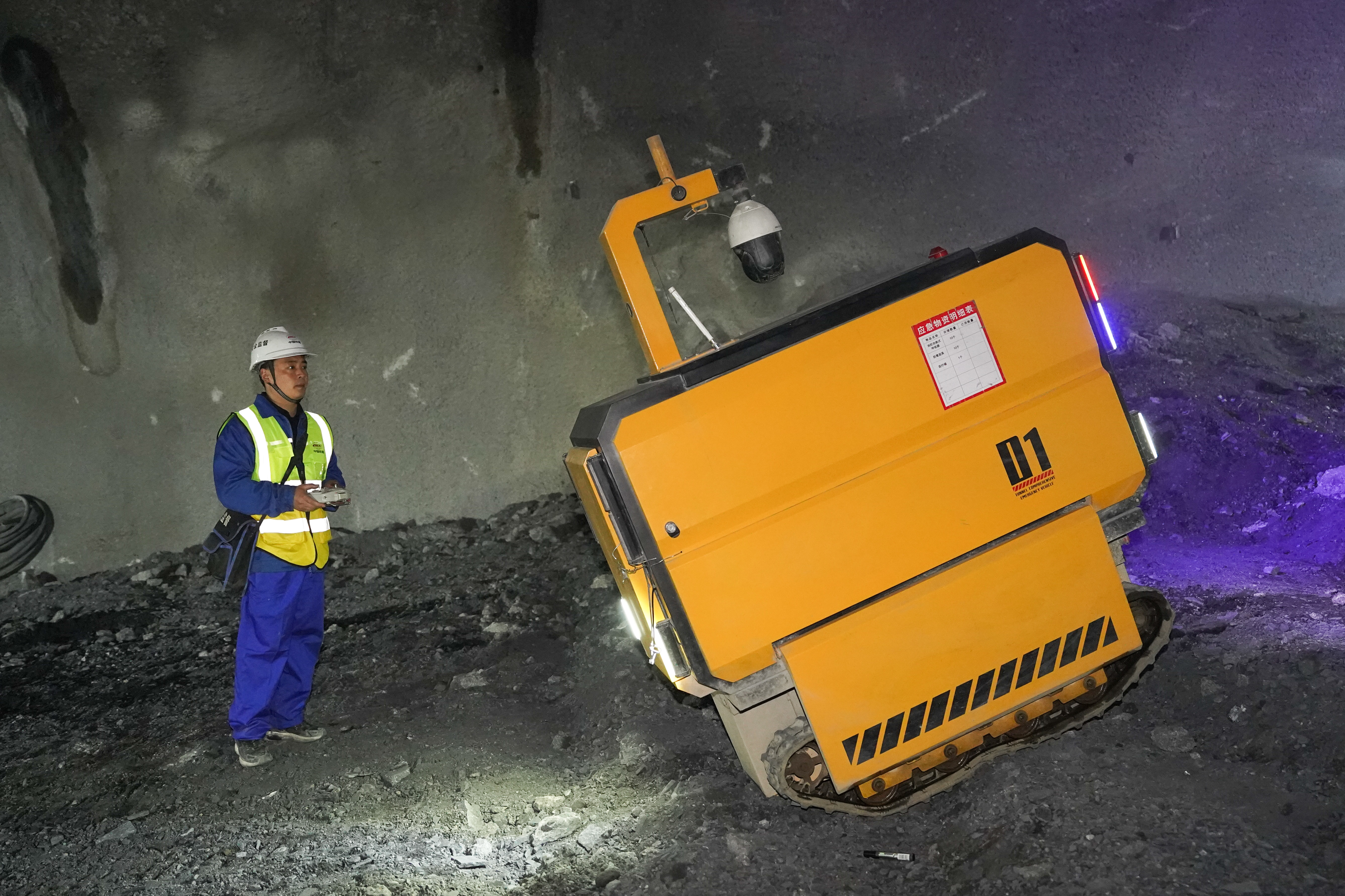 3月29日,工作人员操作智能化一体安全监控机器人在沪宁合高铁丰山隧道内作业。